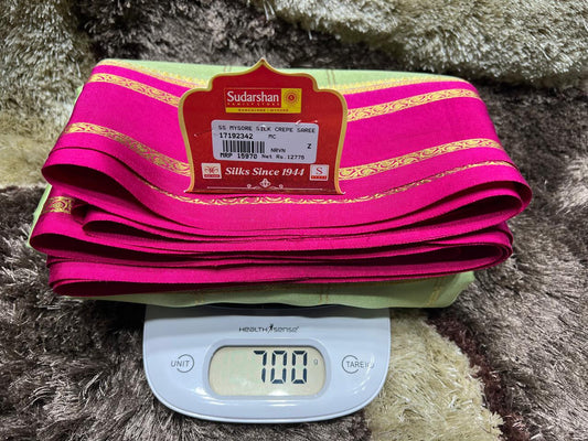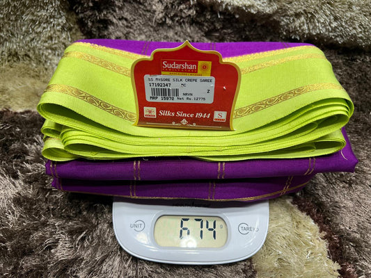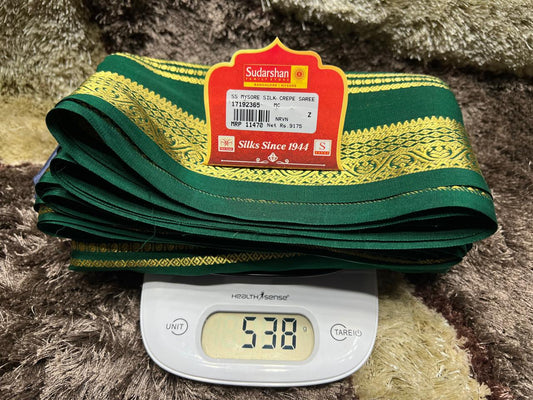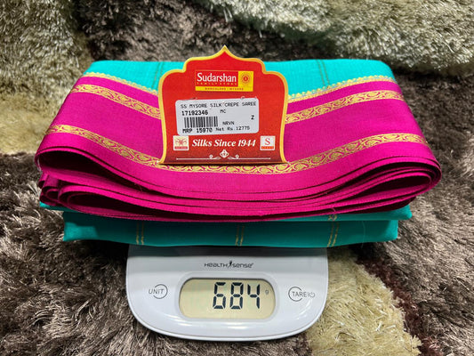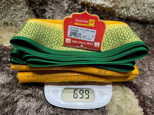 The Mysore silk crepe is woven from hardspun silk yarn and is one of the most widely used form of silk across India. The Mysore silk comes from the city of Mysore in Karnataka, India The earliest mentions of the silken crepe fabric can be traced back to 1785 AD. This was the time when the first silk cocoons where imported to Mysore. It was Tipu Sultan, a great Indian warrior, who in the pursuit of making Mysore a great land, first imported cocoons of silk from China. During Tipu Sultan’s regime, sericulture was formally introduced to Mysore. Thereafter, sericulture became one of the most important industries of Karnataka. Since Mysore silk crepe belongs to an era of ancient India, it traditionally is made of pure silk with gold Zari. Inspired by the natural ambiance and customs of the time, the Mysore silk crepe saree got a face that preserves the heritage of India. Buy exclusive Mysore crape silk sarees at Sudarshan Silk which has proven to be a shopper's delight in wedding sarees, silk sarees for all generations of families. MYSORE SILK ALSO KNOWN AS CRAPE SILK SAREES, WORLDWIDE SHIPPING IN WHOLE SALE PRICES. , India United States United Kingdom Finland Sri Lanka Malaysia Canada Australia Bangladesh France Singapore Switzerland Fiji Bahrain and all
