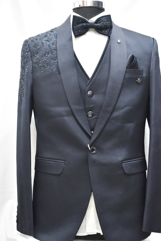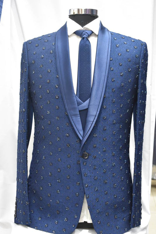 The blazer is a step lower than the suit jacket. It is a hybrid of sorts because it is more formal than a sports jacket but unlike the suit jacket, a blazer is not made with a matching pair of trousers. The Fit. Blazers have a looser fit compared to suitjackets. Formal suits come in three-, four-, or five-piece sets that include pants, vest, and jacket, with shirt and tie included in five-piece sets. Suits are made in a variety of fabrics, but most commonly from wool. The two main yarns produce worsteds (where the fibres are combed before spinning to produce a smooth, hard wearing cloth) and woollens (where they are not, thus remaining comparatively fluffy in texture). These can be woven in a number of ways producing flannel, tweed, gabardine, and fresco among others. These fabrics all have different weights and feel, and some fabrics have an S (or Super S) number describing the fineness of the fibres measured by average fibre diameter, e.g., Super 120; however, For non-business use tweed has been popular since Victorian times, and still is commonly worn. A wide range of colour is available, including muted shades of green, brown, red, and grey.Tweeds are usually checked, or plain with a herringbone weave, and are most associated with the country. Designer Suits - Buy Men Suit, Party wear Suits